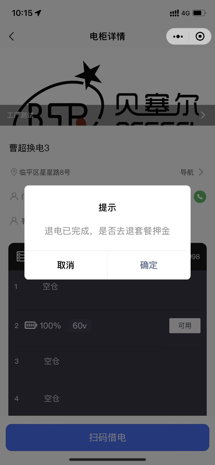 3、接上插頭,關(guān)上倉門后。如果出現(xiàn)下圖彈出框,表示退電成功。點(diǎn)擊【確定】進(jìn)行退押金操作。